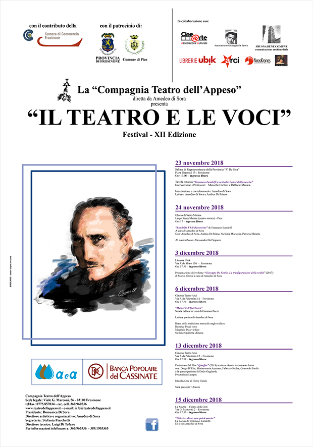 Il Festival “Il Teatro e le Voci”, giunto alla XII Edizione, è una manifestazione artistico-culturale nata nel 2004 che, fin dall’origine, si propone di costituire un momento non occasionale di riflessione storico-critica e di elaborazione artistica sul rapporto Teatro – Immagine – Poesia – Ricerca, con particolare riferimento alla dimensione vocale . L'Edizione odierna è incentrata, come le precedenti, sul valore dell’opera di una eminente personalità artistica che abbia saputo attraversare e/o sollecitare molteplici percorsi. Nelle edizioni precedenti, l'attenzione è stata rivolta a: Carmelo Bene (2004), Dino Campana (2005), Federico Garcia Lorca (2006), Albert Camus (2007), Libero de Libero (2008), Vladìmir Majakovskij (2009) Tadeusz Kantor (2010), Luigi Tenco (2011), Federico Fellini & Marcello Mastroianni (2013), Carlo Ludovico Bragaglia (2015), Pier Paolo Pasolini (2017).