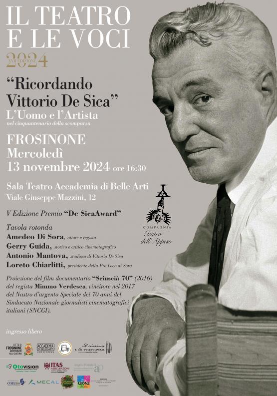 Mercoledì 13 novembre 2024, alle ore 16:30, presso la Sala Teatro dell’Accademia di Belle Arti, in Viale Giuseppe Mazzini 12 a Frosinone, la “Compagnia Teatro dell’Appeso”, sotto la direzione artistica di Amedeo di Sora, promuove e organizza l’evento “Ricordando Vittorio De Sica” (nel cinquantenario della scomparsa), che è collegato con la V Edizione del Premio “De SicaAward”.
