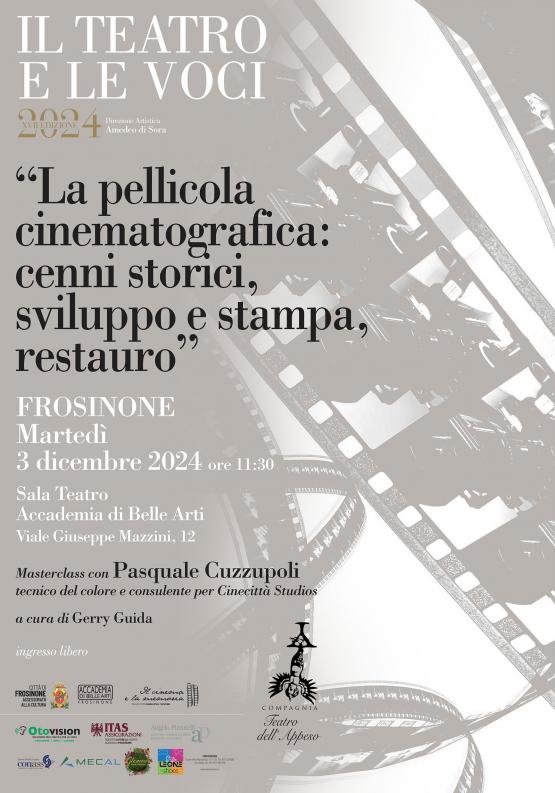 Martedì 3 dicembre 2024, alle ore 11:30, presso la Sala Teatro dell’Accademia di Belle Arti, in Viale Giuseppe Mazzini 12 a Frosinone, la “Compagnia Teatro dell’Appeso”, promuove e organizza la Masterclass con Pasquale Cuzzupoli, tecnico del colore e consulente per Cinecittà Studios, sul tema: La pellicola cinematografica: cenni storici, sviluppo e stampa, restauro”.