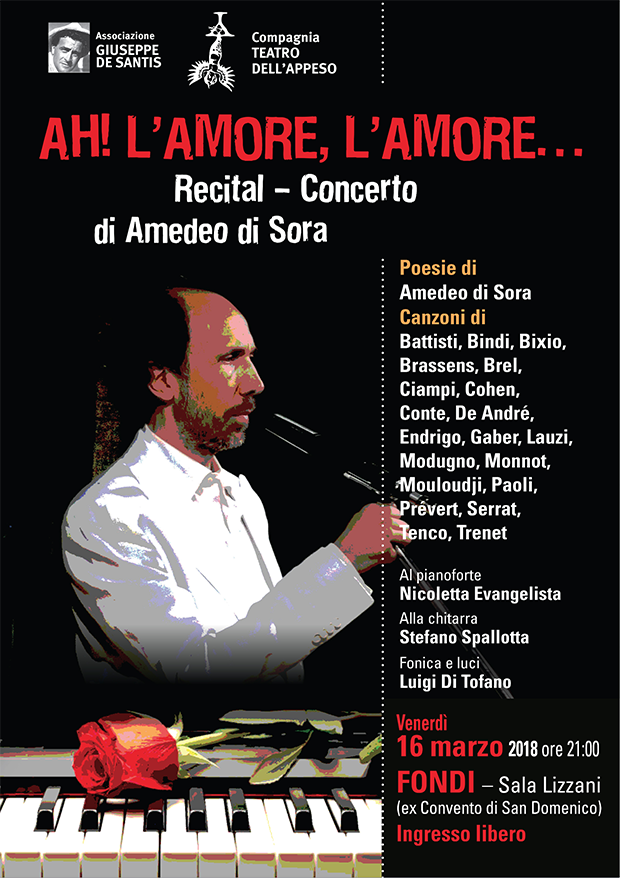 Venerdì 16 marzo alle ore 21:00, nella Sala Lizzani (ex Convento di San Domenico) a Fondi, in collaborazione con l’Associazione “Giuseppe De Santis”, si terrà lo spettacolo teatral - musicale dal titolo “Ah! L’amore, l’amore…” ad opera della “Compagnia Teatro dell’Appeso”.Autore e attore-regista dello spettacolo è Amedeo di Sora, che interpreta, con l'accompagnamento del maestri Stefano Spallotta alle chitarre e Nicoletta Evangelista al pianoforte, una serie significativa di sue poesie e di canzoni d'autore che hanno come tematica il sentimento amoroso nelle sue diverse significazioni: da Trenet a Tenco, da Modugno a De André, da Lauzi a Paoli, da Prévert a Bindi, da Battisti a Conte, da Endrigo a Ciampi, da Monnot a Gaber, e ad altri indimenticabili autori che hanno saputo celebrare magistralmente i volti diversi dell'amore.